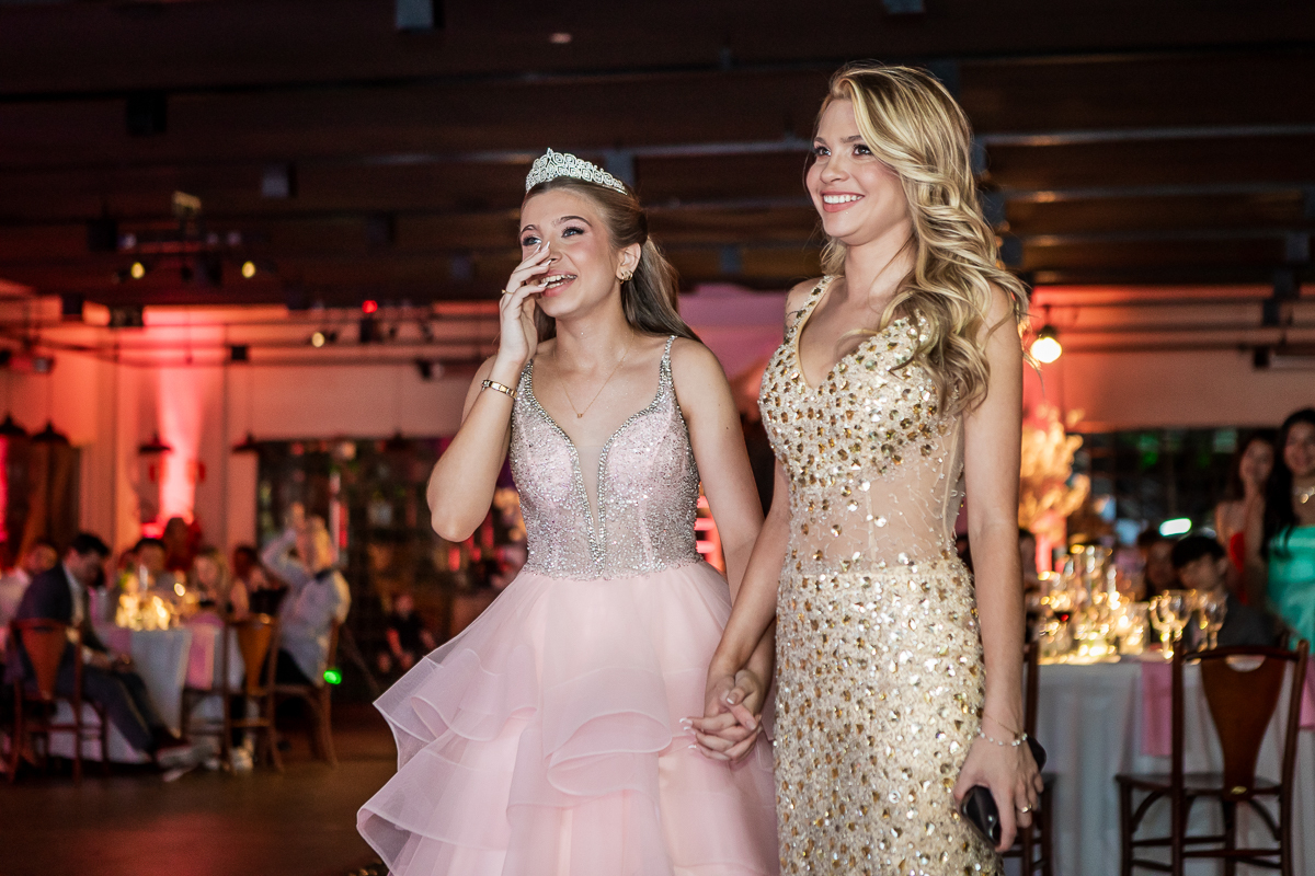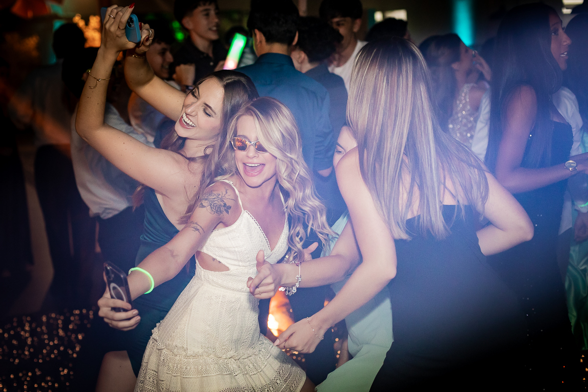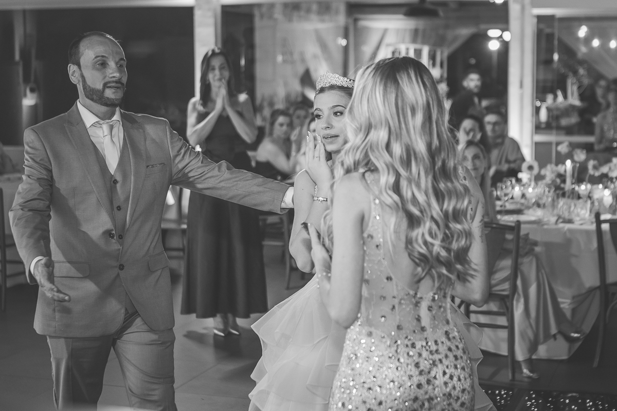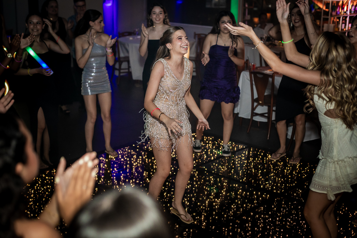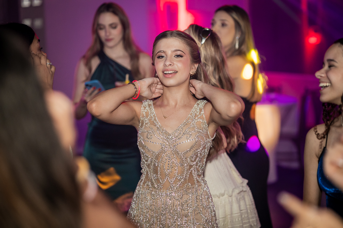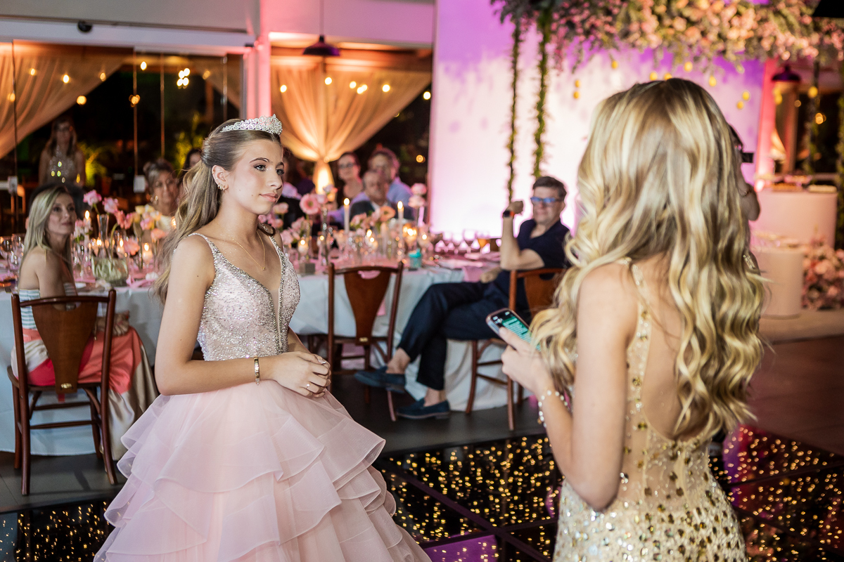 Meu olhar buscava transformar sentimento em imagem. As fotografias clássicas, que não podem faltar em um álbum de debutante, se misturavam com momentos espontâneos: passos animados na pista de dança, risadas sinceras com as amigas, olhares tímidos e cheios de expectativa.