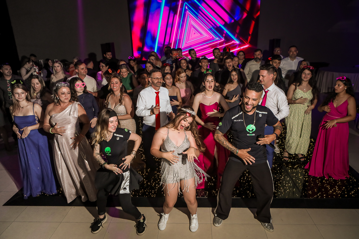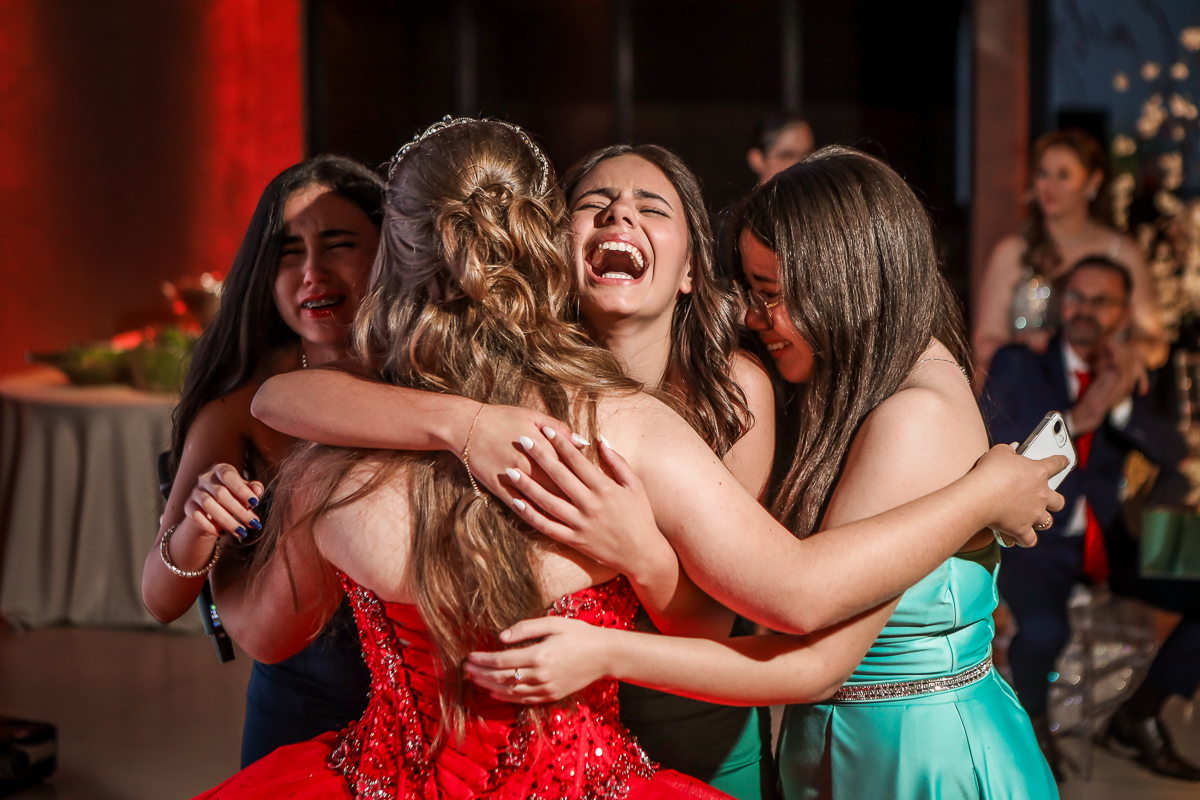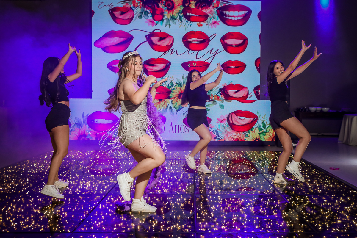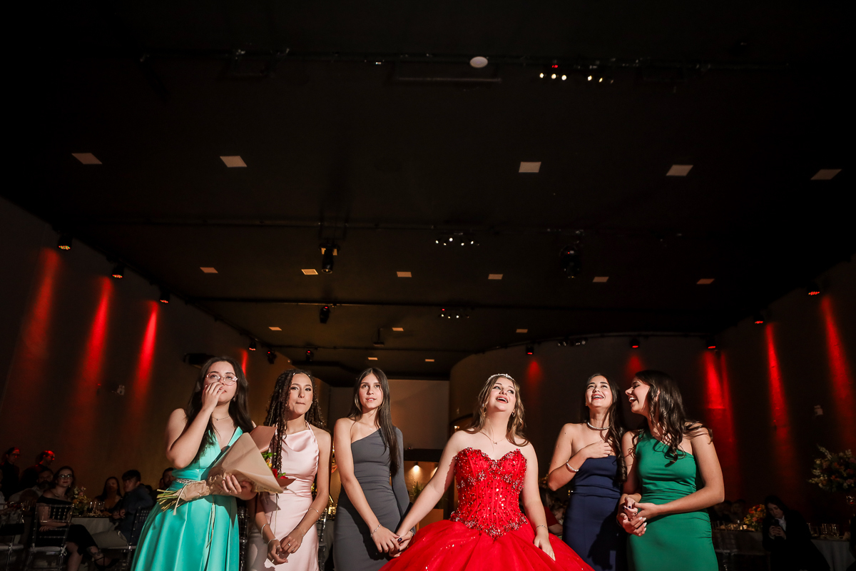 Minha lente buscava converter emoção em fotografia. As poses tradicionais, fundamentais em um álbum de 15 anos, mesclavam-se com cenas genuínas: movimentos intensos na pista de dança, gargalhadas reais com as convidadas, semblantes tímidos e repletos de esperança.