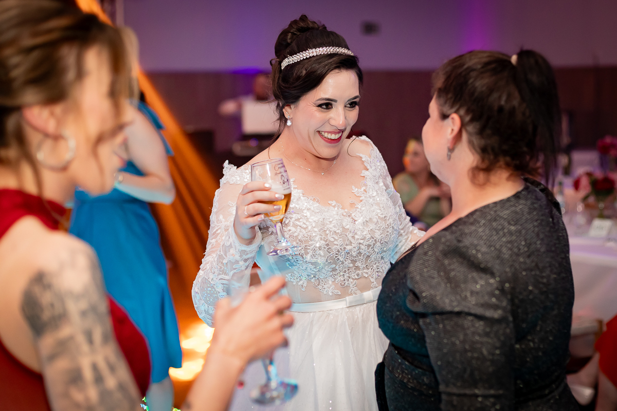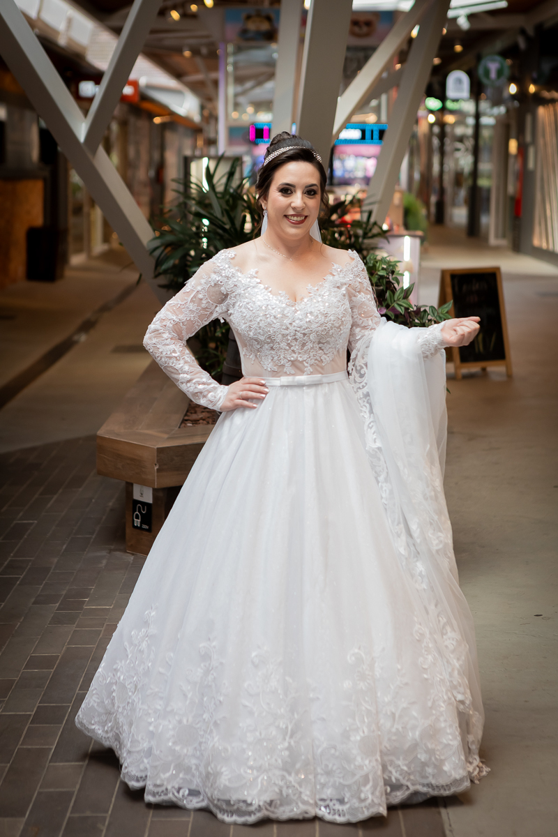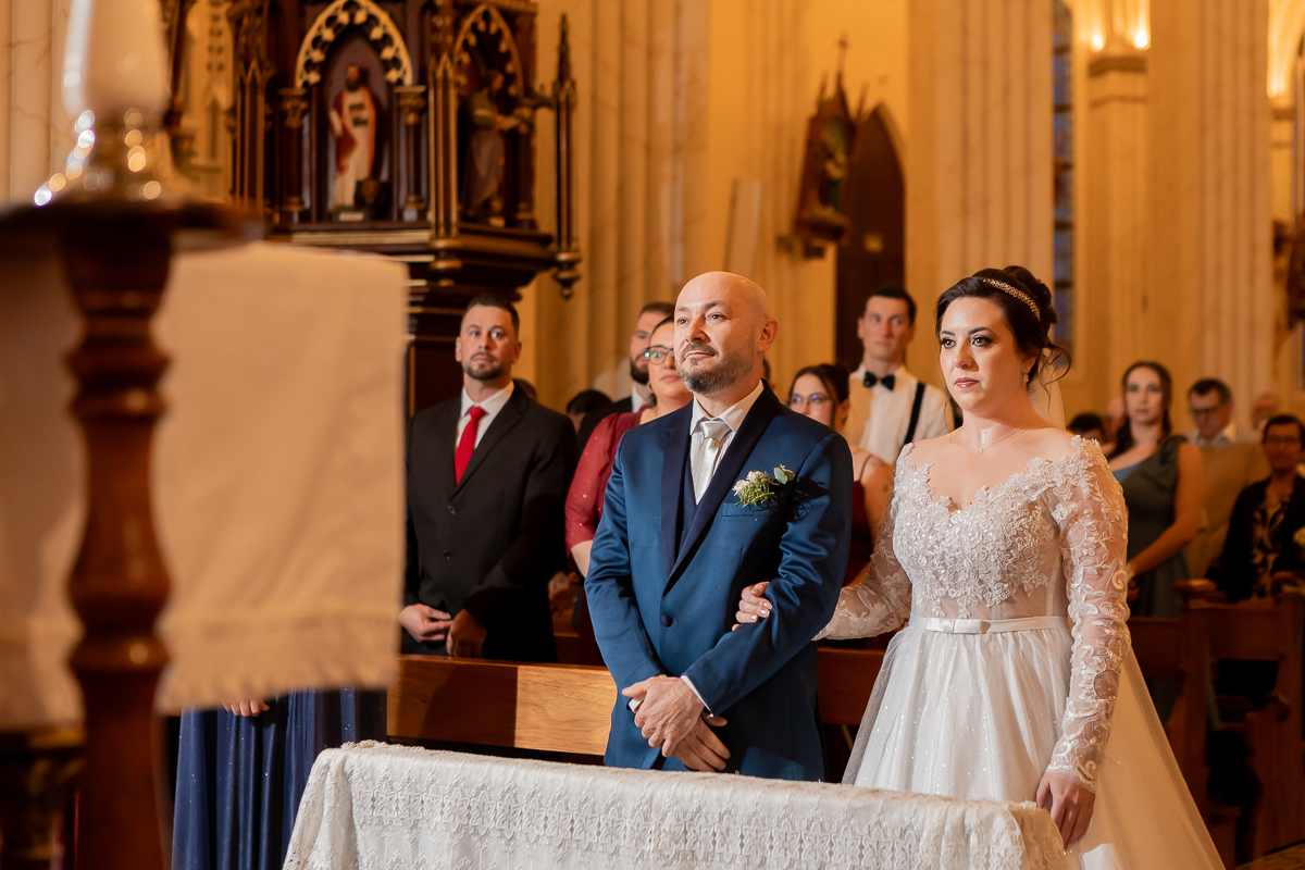 Outro ponto importante é aproveitar bem os momentos de transição: a chegada à igreja, o caminho até a Igreja São Pedro, a entrada no salão, discursos, primeira dança… Nesses intervalos acontecem muitos dos registros mais emocionantes. Conversar com o fotógrafo sobre a programação ajuda a garantir que nada se perca.