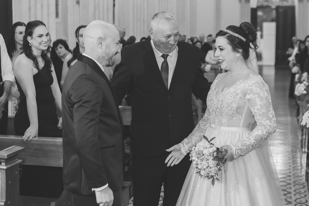 Na festa, o clima continuou leve e intenso: discursos emocionantes, a primeira dança, a pista animada, o buquê e até fotos em preto e branco repletas de sentimento. Cada clique é um convite para reviver a energia que tomou conta da Igreja São Pedro em Garibaldi RS.