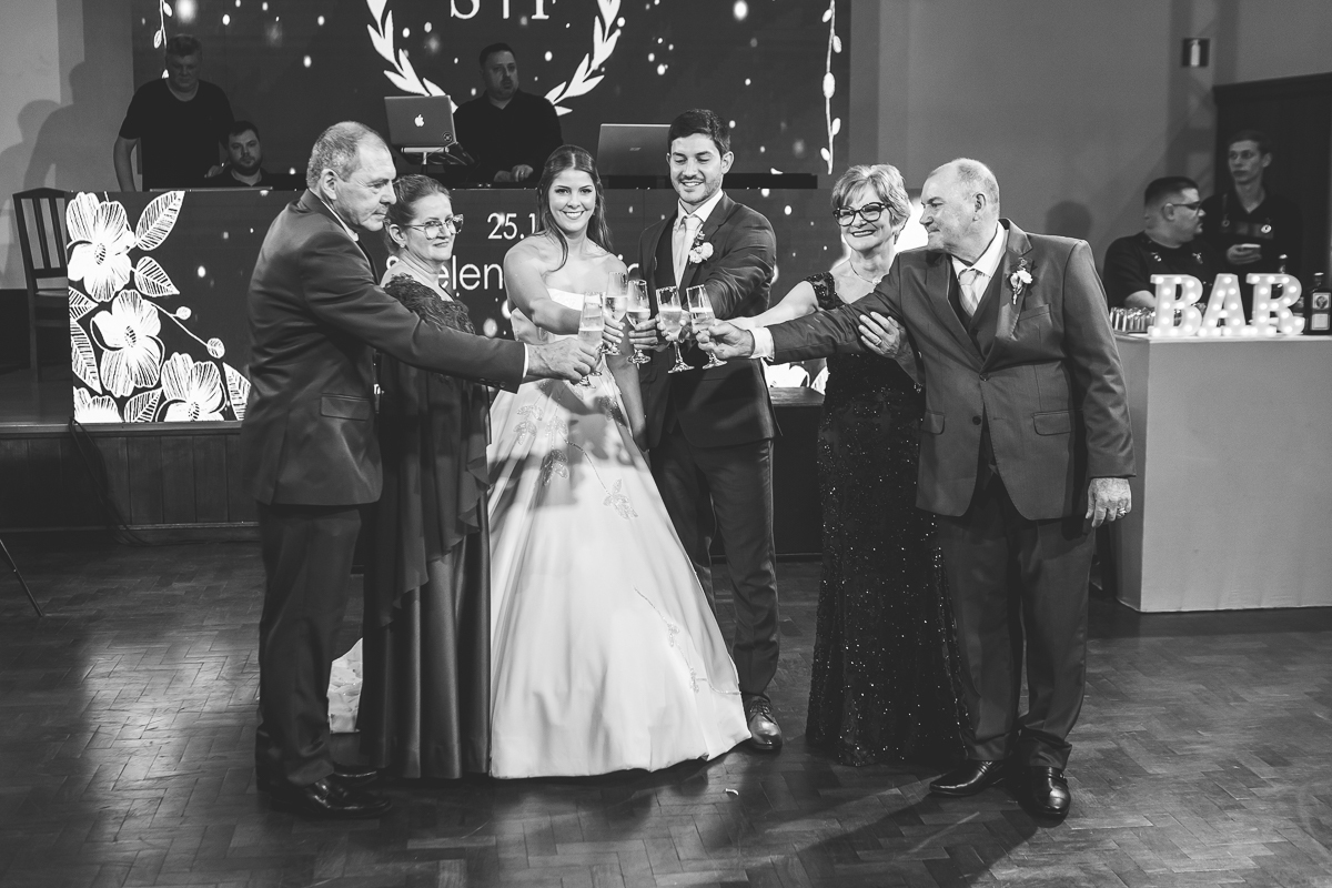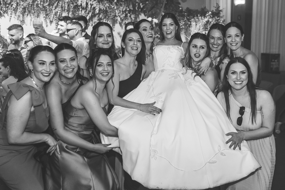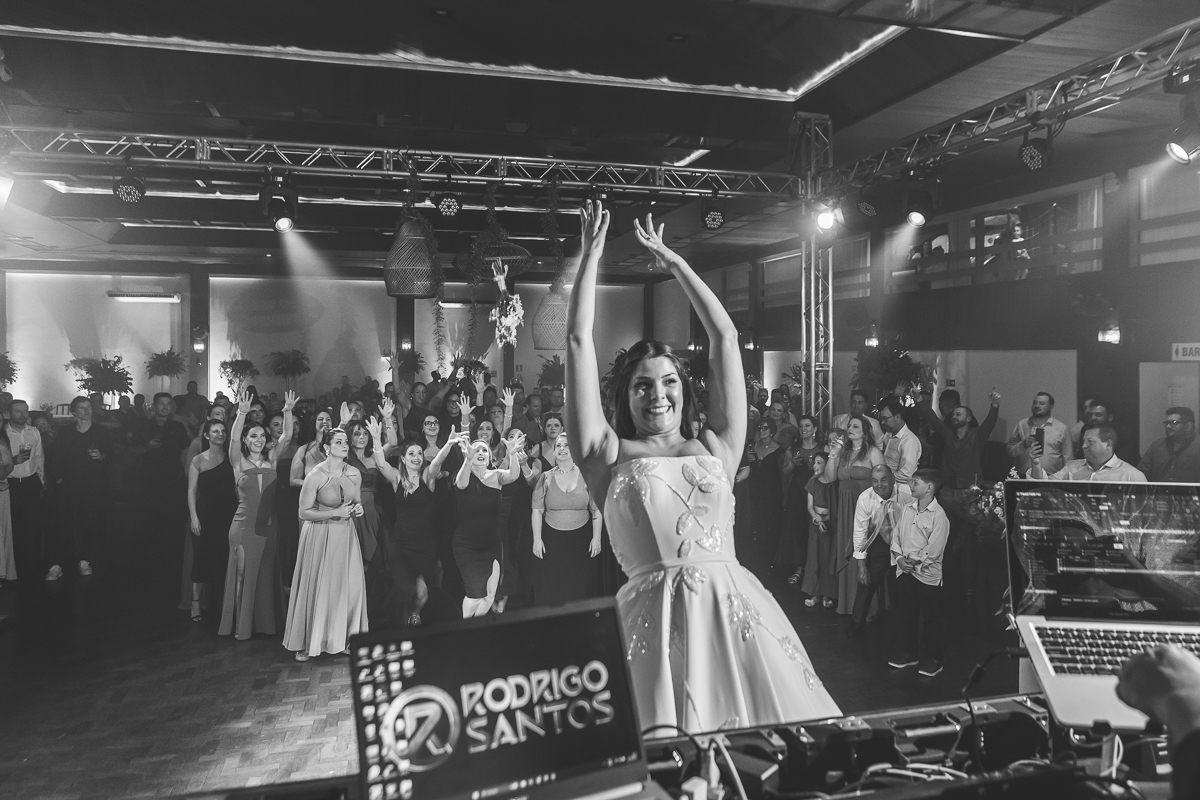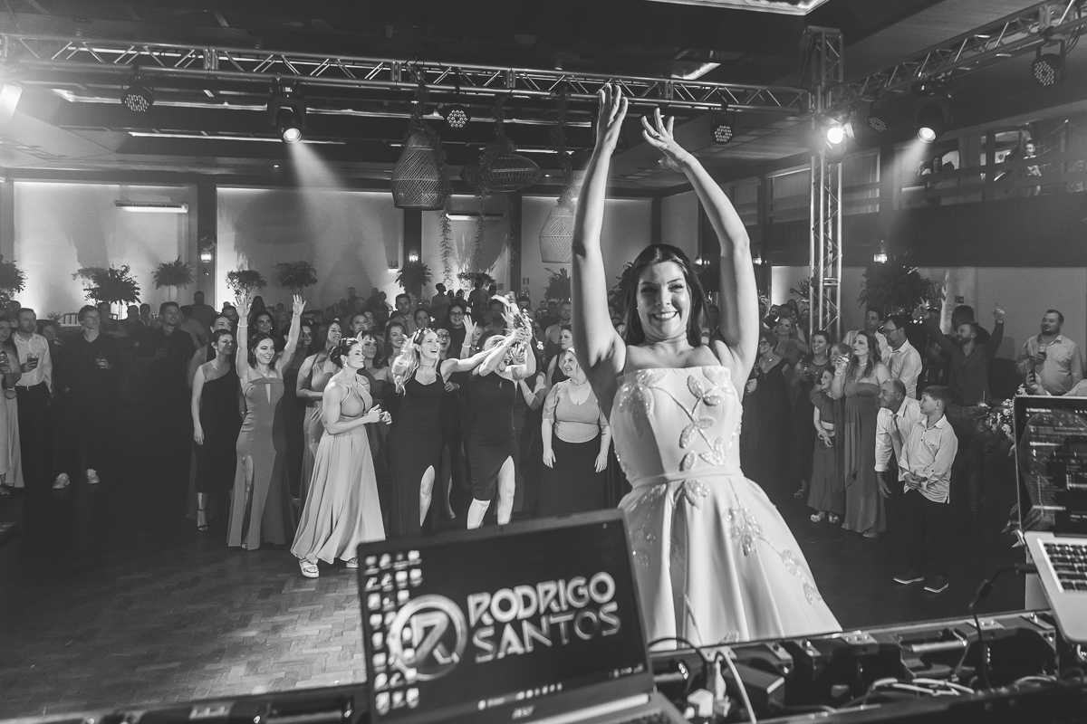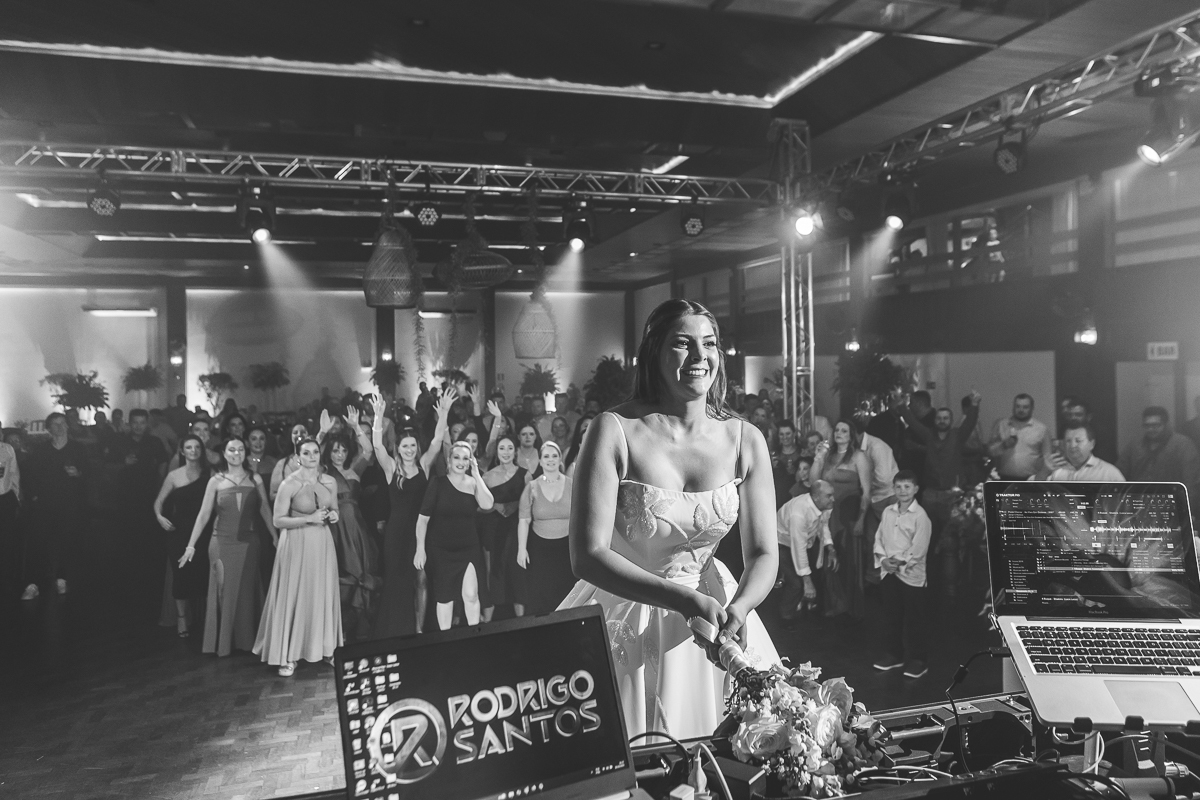 A troca das alianças, o beijo sobre elas e a bênção final foram carregados de simbolismo. Na festa, a celebração seguiu intensa e cheia de emoção: discursos marcantes, a primeira dança, a pista animada, o buquê e muitos registros espontâneos que traduzem a energia daquele dia.