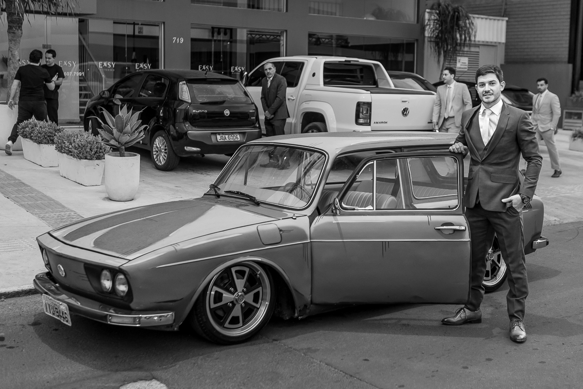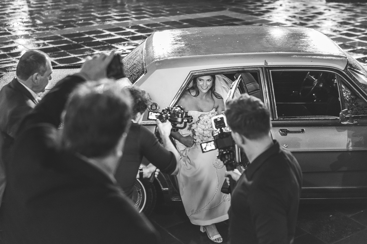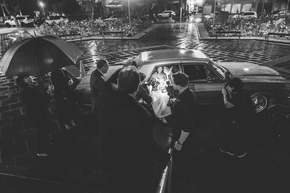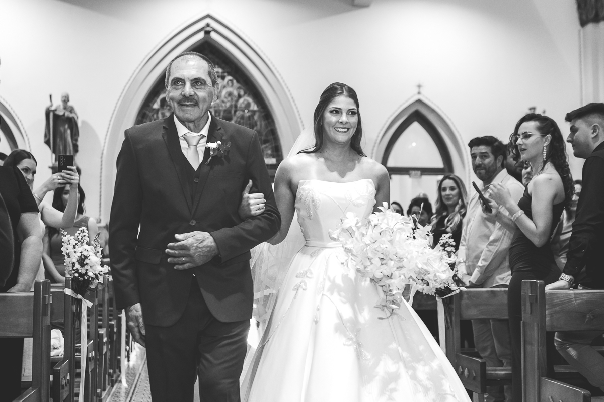 A chegada da noiva à Igreja Matriz Cristo Rei foi inesquecível. O carro antigo, as escadarias, a luz natural iluminando o vestido e a emoção estampada no rosto de todos criaram uma cena única. No corredor, o abraço da mãe, o beijo carregado de sentimento e a pausa silenciosa antes de caminhar até o altar definiram a essência de um casamento vivido com intensidade.